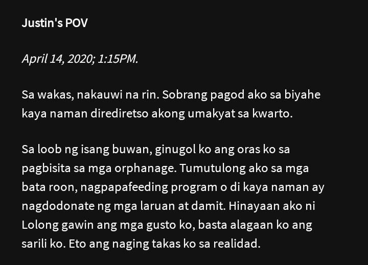 Hugasan ang mukha ng maligamgam na tubig sa umaga. Nagpapanggap daw sila bilang mga supplier at buyer habang ang kanilang. Nagpaalam ako kay Bert at tinahak ko ang daan papuntang library para sa panibagong araw ng pagtatrabaho.